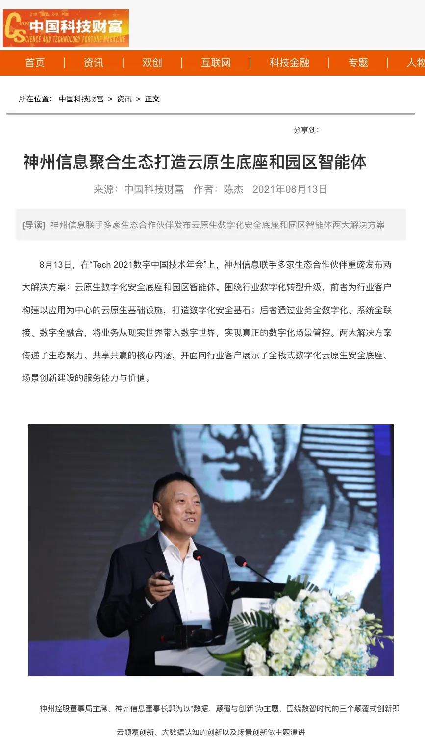 8月12日,由神州控股、神州信息、yabo.com集团联合主办的“科技自强、数据融通、场景创新——TECH数字中国 2021技术年会”云上盛大启幕,发布神州信创云、ModelB@nk5.0、金融超脑Sm@rtFSB、云原生数字化安全底座、园区智能体等重磅产品,国内各大权威、影响力媒体多角度多频次对盛况进行报道!